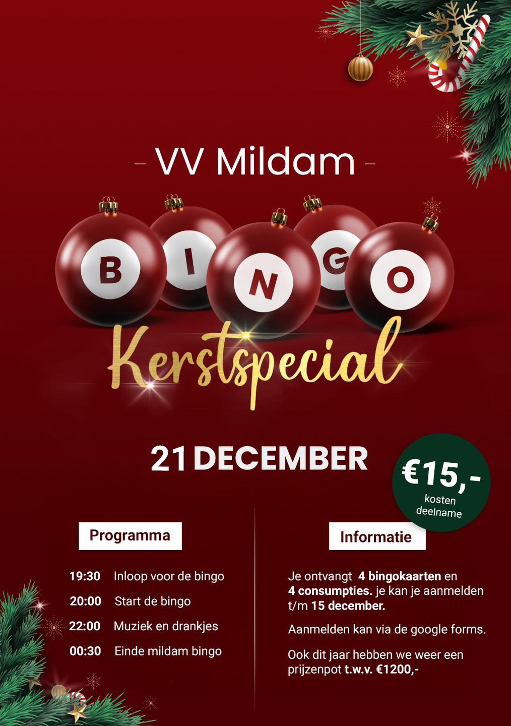 Op zaterdag 21 december organiseert VV Mildam weer kerstbingo! Voor slechts โฌ15,- krijg je 4 bingokaarten en 4 consumpties. Daarnaast maak je kans op een prijzenpot van maar liefst โฌ1200,-! De avond begint om 19:30 uur met de inloop, waarna de bingo om 20:00 uur van start gaat. Na afloop is er tijd voor muziek en gezelligheid. Schrijf je in vรณรณr 15 december via de link hieronder en mis deze feestelijke avond vol spanning en plezier niet!